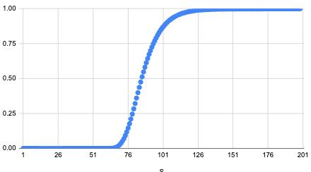 Calculating the exact probability that our approach works is more difficult than the coin toss example, but follows the same principle of failure becoming exponentially more unlikely across several trials. We can use some assumptions (notably the central limit theorem) to calculate a rough approximation of the probability of success. Here is a graph of the probability of passing the problem given a certain value of SS. Note that the probability of success remains is largely the same across different counts of distinct colors along the path.
